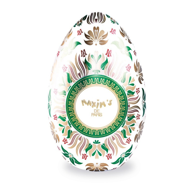 This elegant metal box is filled with hazelnut praline chocolate eggs, individually wrapped in Maxim's colors.