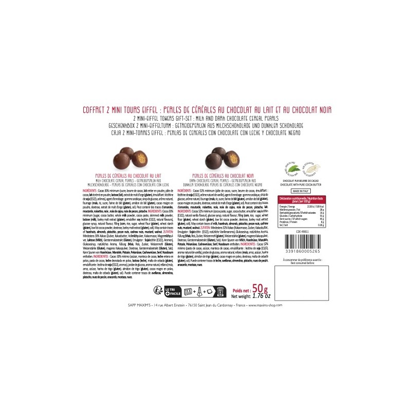 Discover the set of two Maxim’s Mini Eiffel Towers filled with chocolate-coated cereal pearls – a gourmet gift set featuring an iconic design inspired by Paris’s most famous landmark. These two elegant mini metal tins pay homage to the Parisian spirit with a refined and original touch.