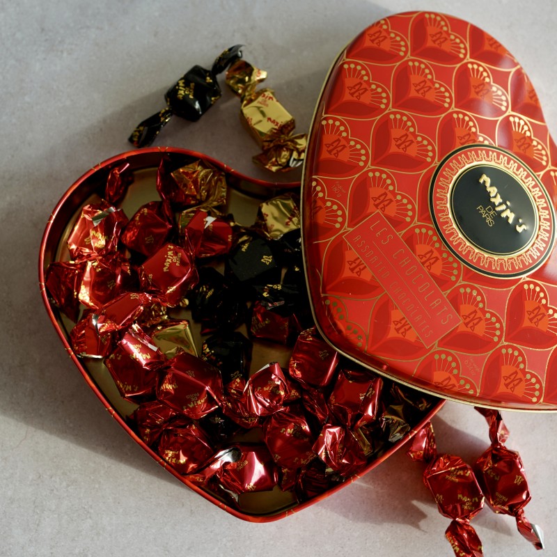 A big heart tin even more generous to complement the red, gold & black model and enjoy a wide variety of chocolates specialties. In this box you will find 3 varieties of chocolates: