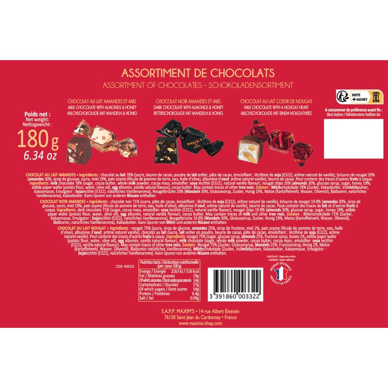 - Dark chocolates with crunchy nougat chips, almonds & honey