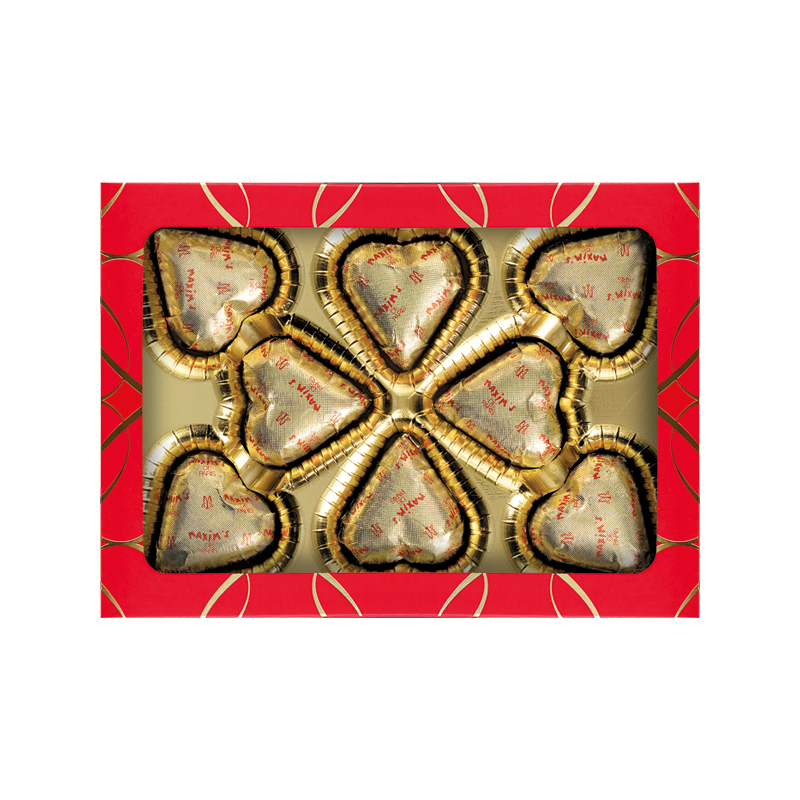 Presented in a new elegant and refined design, the box is adorned with an intense red color enhanced by delicate golden heart motifs, symbols of love and indulgence. A modern and romantic gift box, ideal for gift giving.