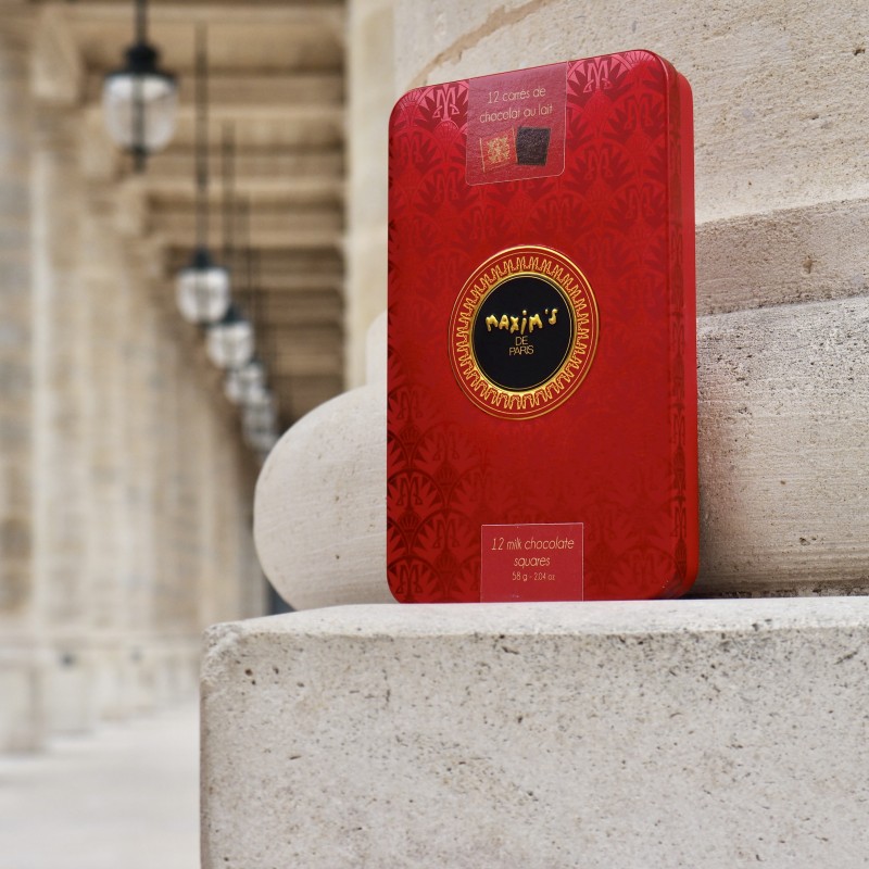 Discover the charm and elegance of this stylish red pencil tin, filled with 12 delectable milk chocolate squares infused with crunchy praline chips.