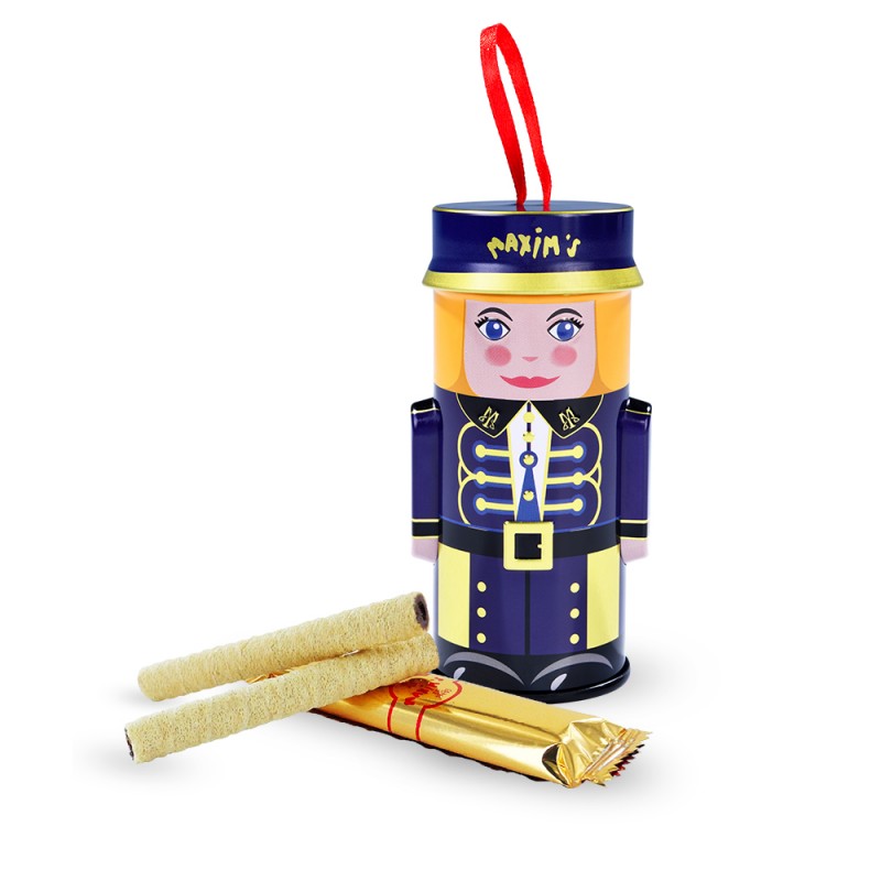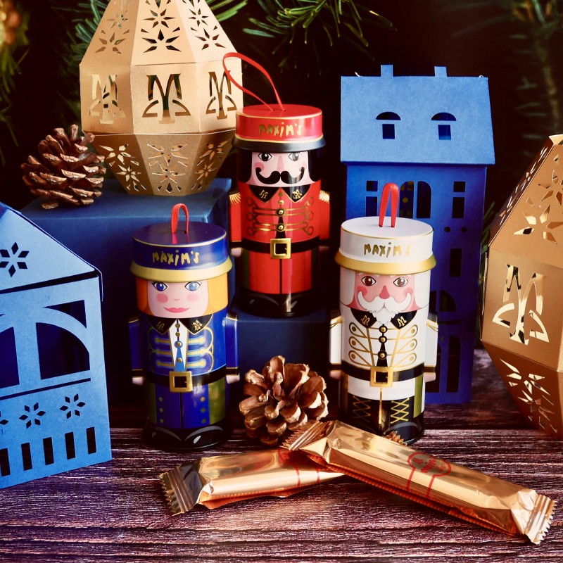 Three mini-grooms metal tins, perfect for the Christmas tree or as a gourmet gift, containing four chocolate and hazelnut-filled flutes for an irresistible festive treat.