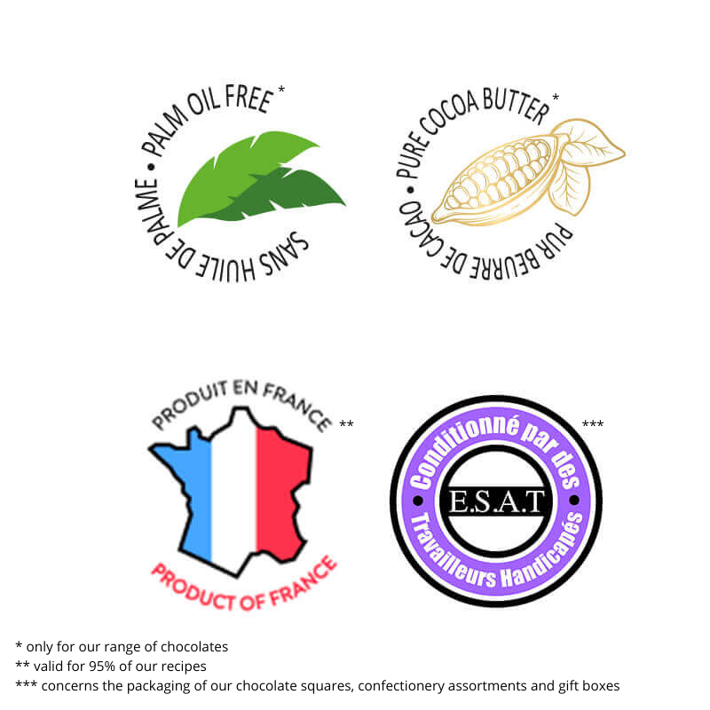 Maxim's know-how is also a real commitment to society and the environment, starting with the choice of palm oil-free and pure cocoa butter chocolates and continuing with mainly French production, which highlights the richness of our industrial, craft and gastronomic fabric.