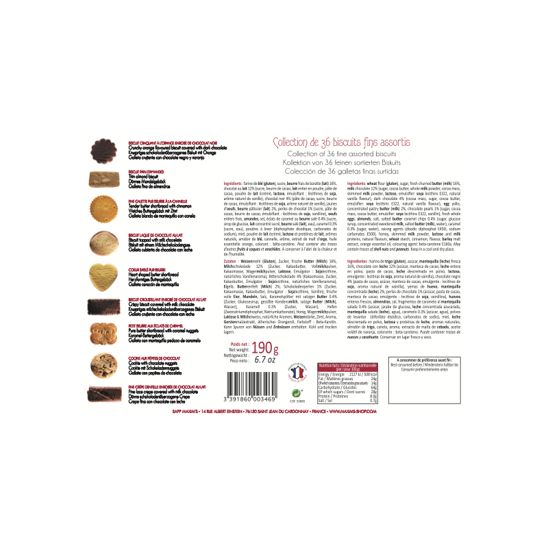 Pure butter cookies, chocolate cookies, caramel cookies, cinnamon cookies, chocolate covered crêpes dentelles or almond bread. This magnificent metal box closes a generous choice to make you lose your head!