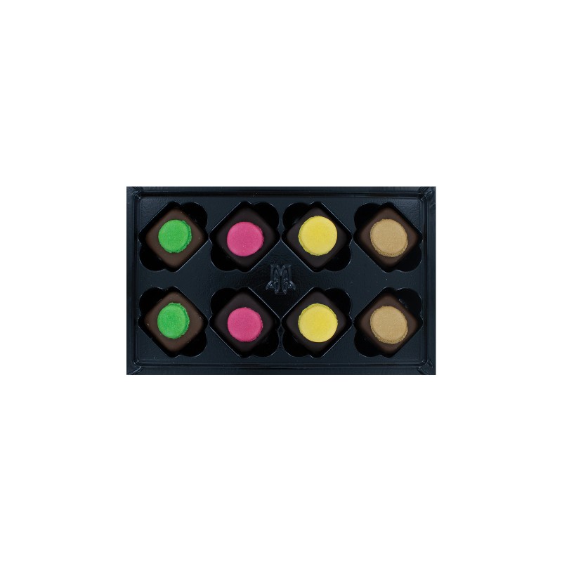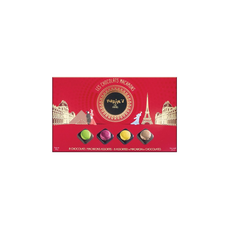 A travers ce nouvel étui, Maxim’s célèbre le mariage gourmand du macaron et du chocolat dans un étui de 8 chocolats fins couronnés d’une authentique coque de macaron.