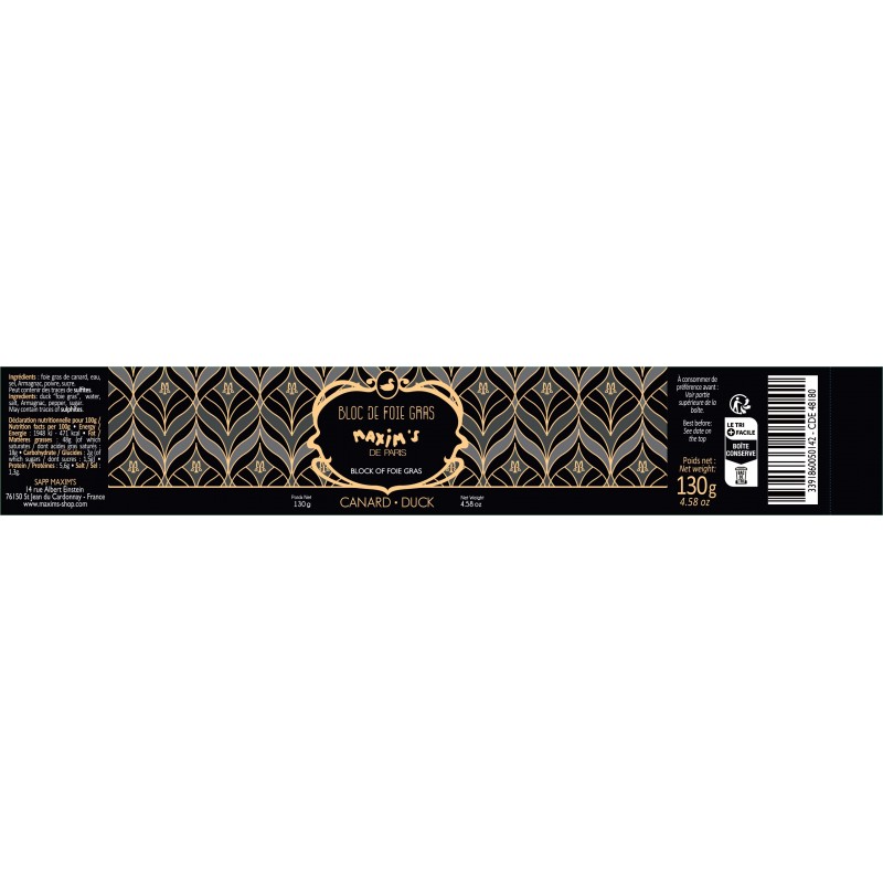 Découvrez le bloc de foie gras de canard Maxim’s, une spécialité incontournable de la gastronomie française, alliant caractère, finesse et tradition. Élaboré et fabriqué en France à partir de morceaux 100 % foie gras de canard soigneusement sélectionnés, ce bloc offre une texture ferme et fondante ainsi qu’un goût riche aux saveurs authentiques du terroir.