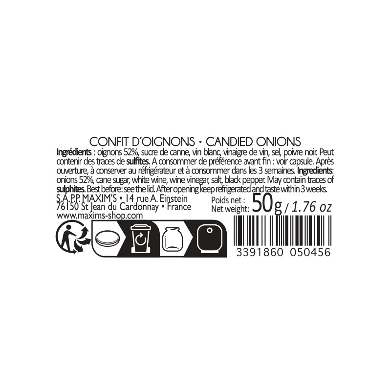 Oignons, sucre de canne, vin blanc, vinaigre, sel, poivre, gélifiant : pectine