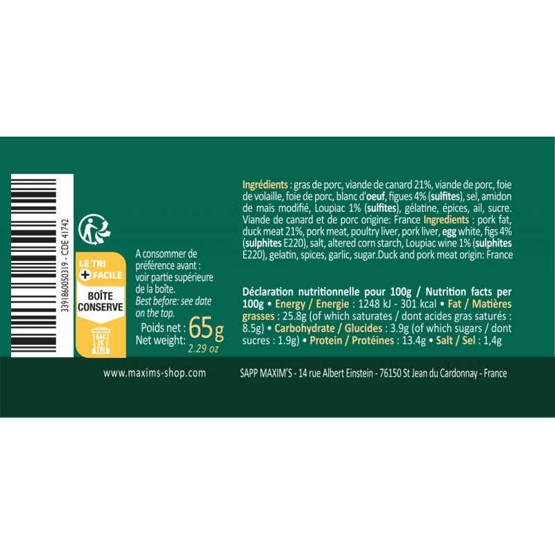 gras de porc, viande de canard 21%, Viande de porc, foie de volaille, foie de porc, blanc d'oeuf, figues 4% (sulfites), sel, amidon de maïs modifié, Loupiac 1% (sulfites), gélatine, épices, ail, sucre