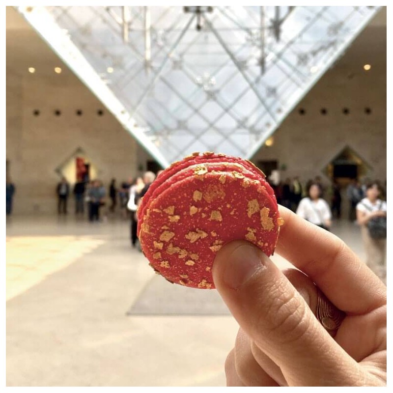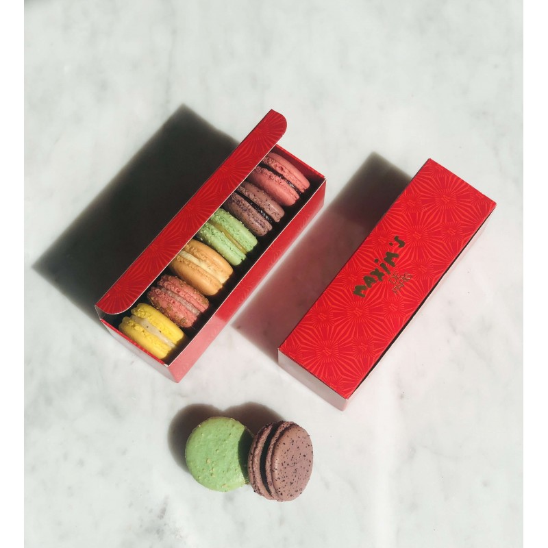 Dans un fourreau de 6 macarons, retrouvez 6 saveurs différentes, plus fruitées les unes et que les autres ainsi que le macaron signature Maxim’s « Napoléon » :