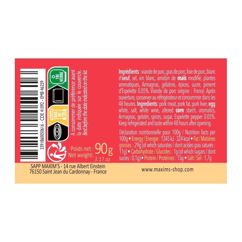 Viande de porc, gras de porc, foie de porc, oeuf, sel, amidon de maïs modifié, gélatine, vin blanc, Armagnac, épices, oignons, échalote, ail, sucre, piment du Sud ouest 0, 05%